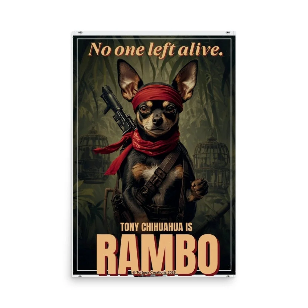This premium poster features Tony Chihuahua stepping into the boots of the legendary John Rambo. Rendered in a gritty, illustrative caricature style, it captures the intense spirit of the "No One Left Alive" ethos—perfect for action movie buffs, chihuahua enthusiasts, and anyone who appreciates a touch of wit in their decor.