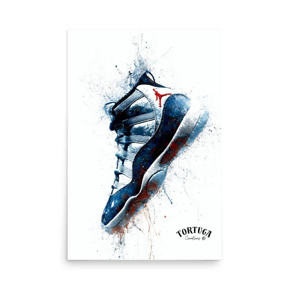Tortuga Creations Stylized Retro Air Jordan 11 Sneaker Art Poster (Classic Watercolor Splatter Design)